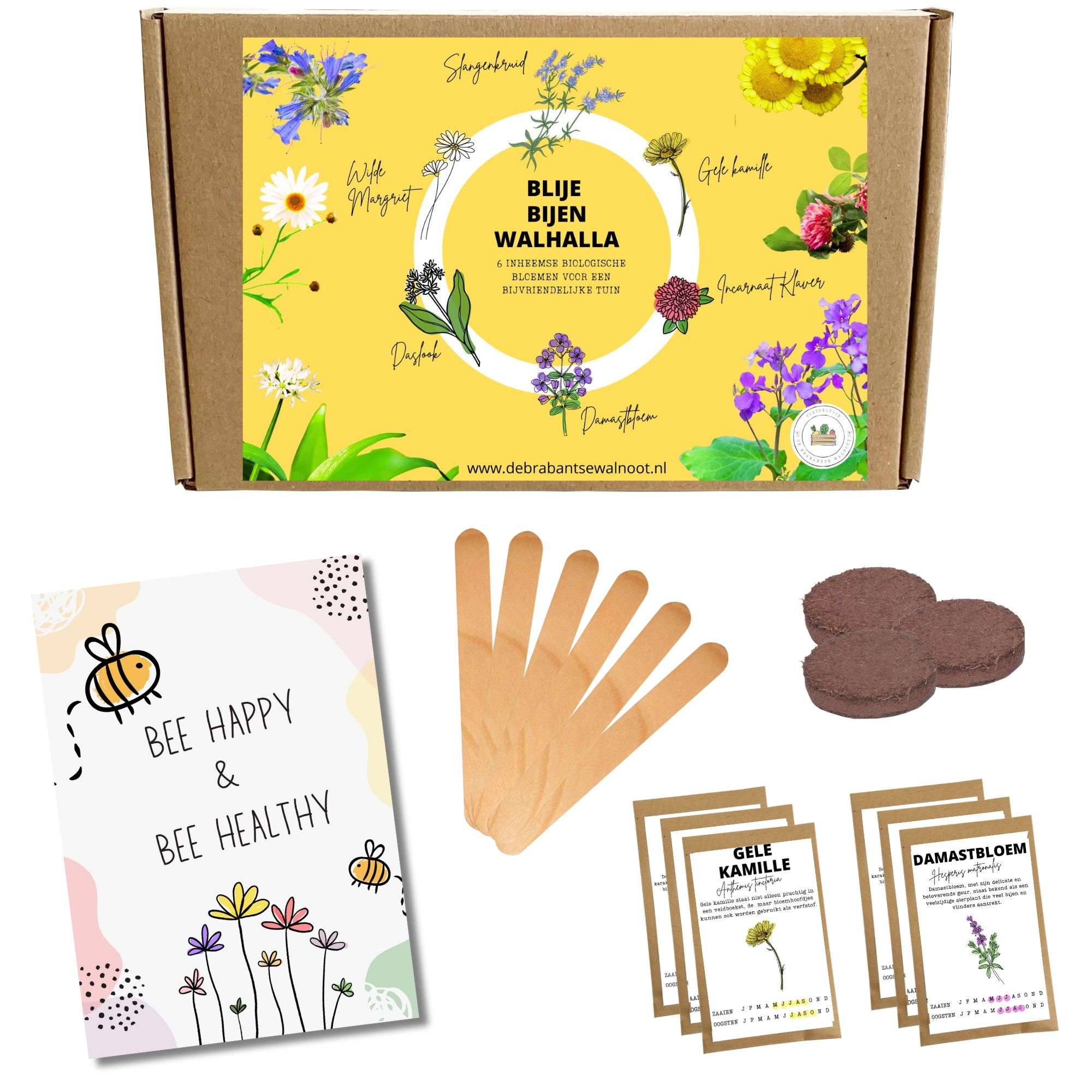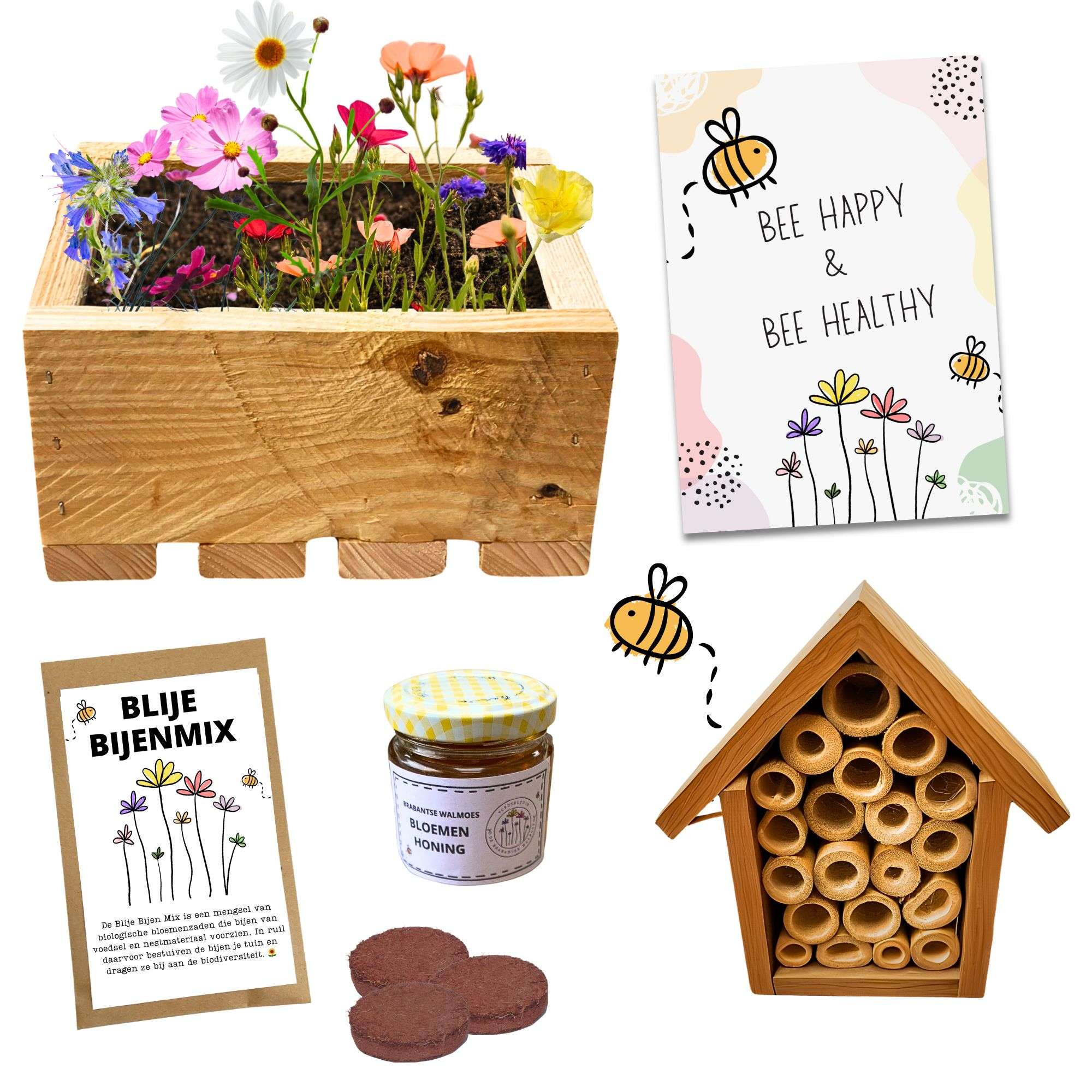 De Blije Bijen Box bevat alles wat je nodig hebt om de bijen te helpen en de biodiversiteit te bevorderen: