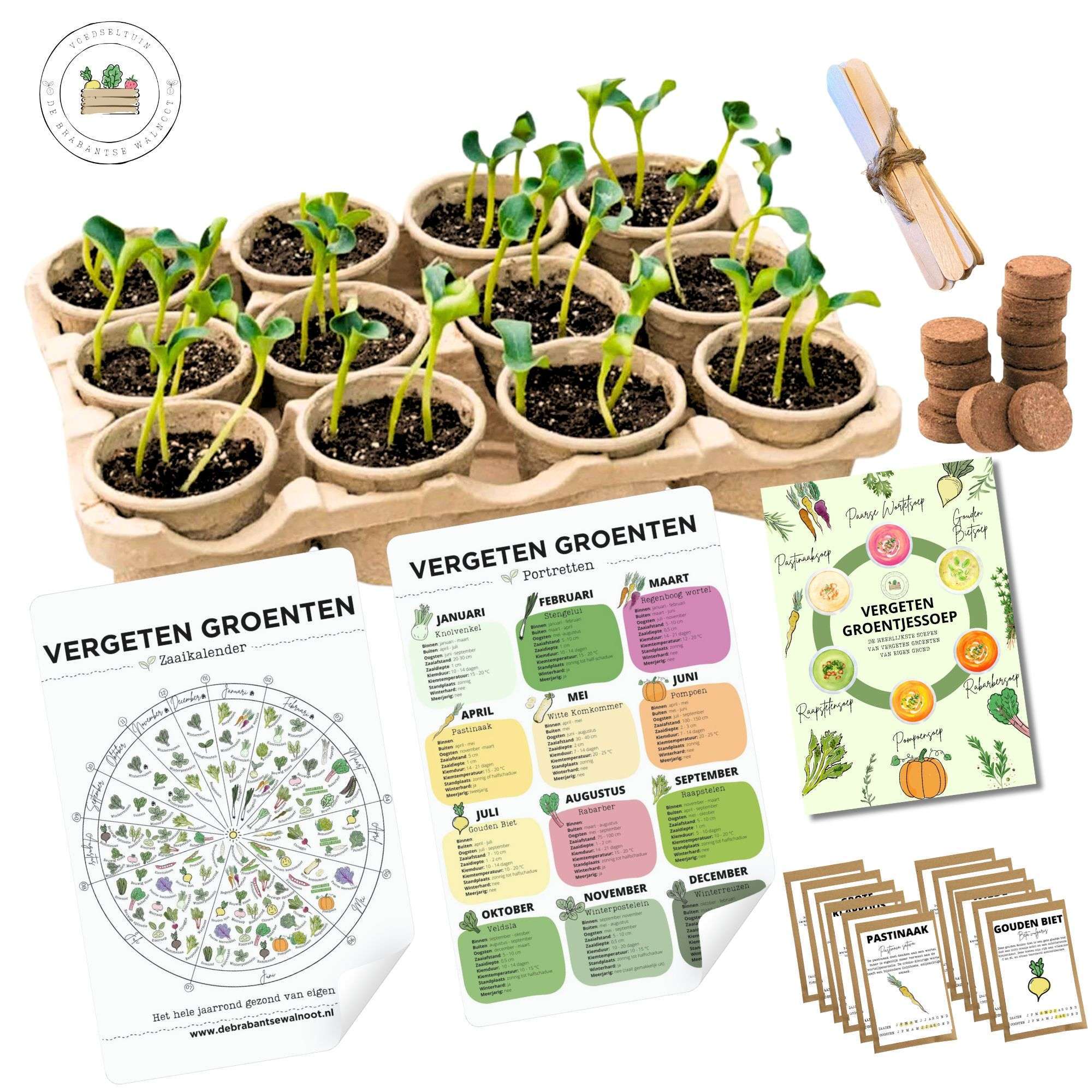 • 12 zakjes met vergeten groente zaden: Zaai elke maand een andere vergeten groente: Knolvenkel, Stengeluit, Regenboog wortel, Pastinaak, Witte komkommer, Pompoen, Gouden Biet, Rabarber, Raapstelen, Veldsla, Winterpostelein en Winterreuzen.