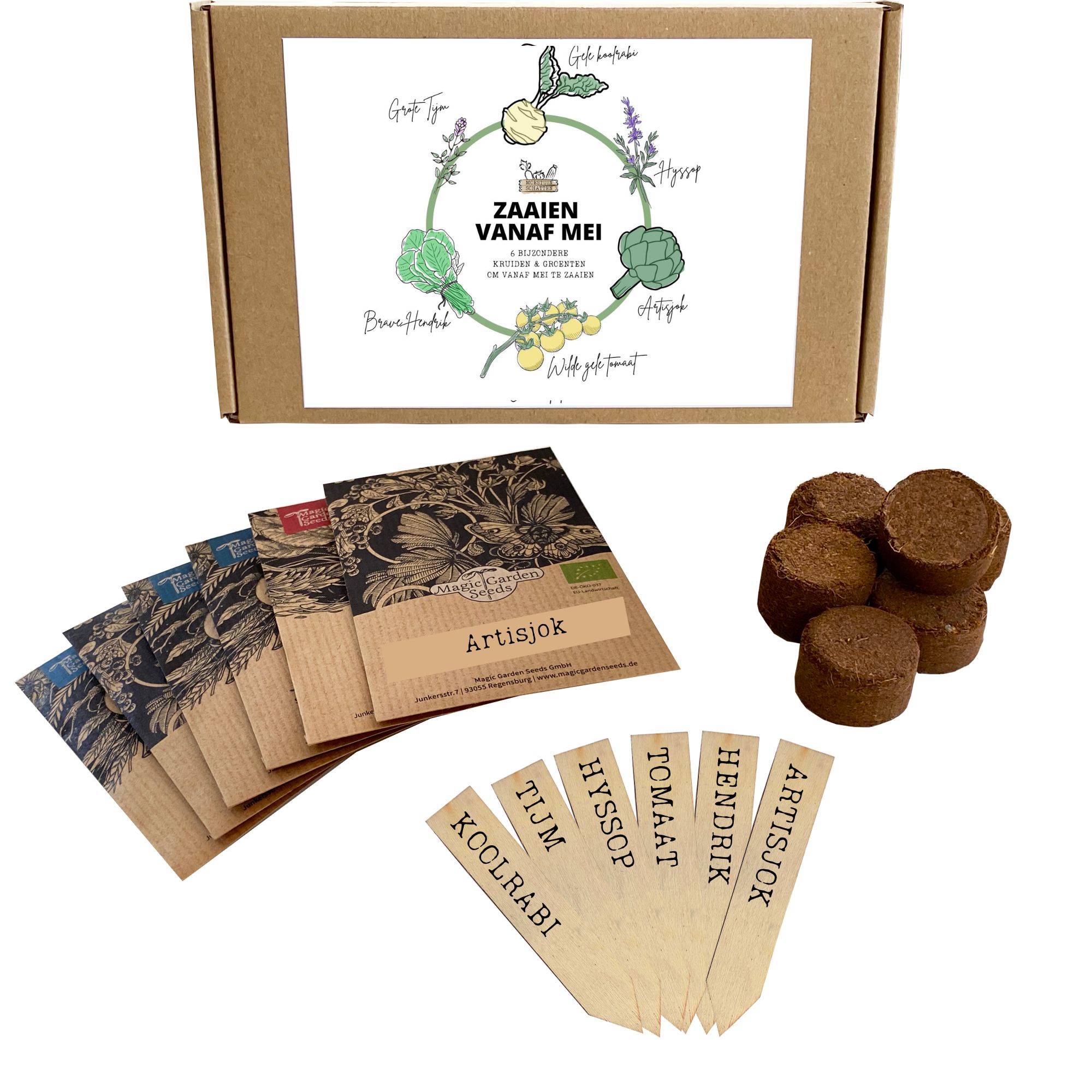 De box bevat in totaal 6 zakjes met biologische zaden die je vanaf april kunt zaaien en later in het jaar kunt oogsten.
