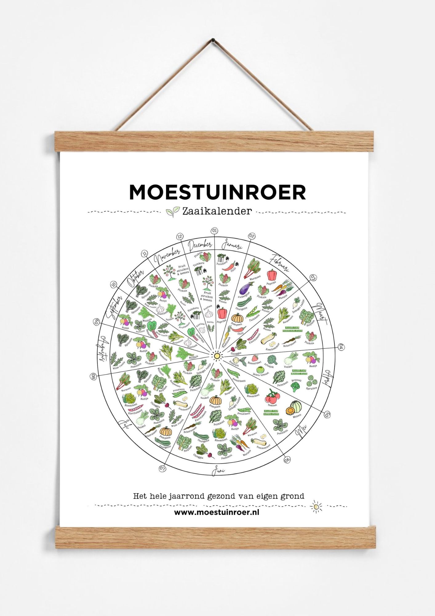 - Maandelijkse Zaai-instructies en Plantportretten – Op de voorkant vind je een overzicht van welke groenten je per maand kunt zaaien. De achterkant van de kalender biedt extra inspiratie met gedetailleerde plantportretten van vergeten groenten, uitgelicht per maand. Zo leer je elke maand meer over een specifieke groente die in die periode gezaaid kan worden.